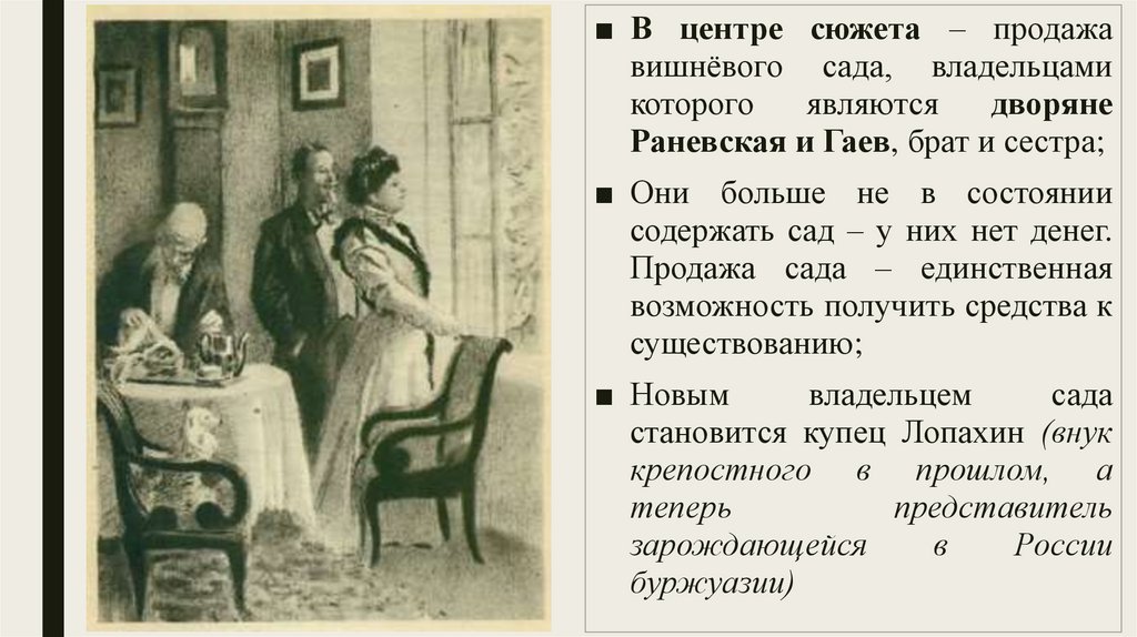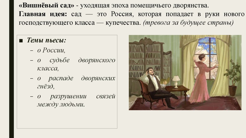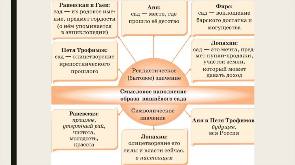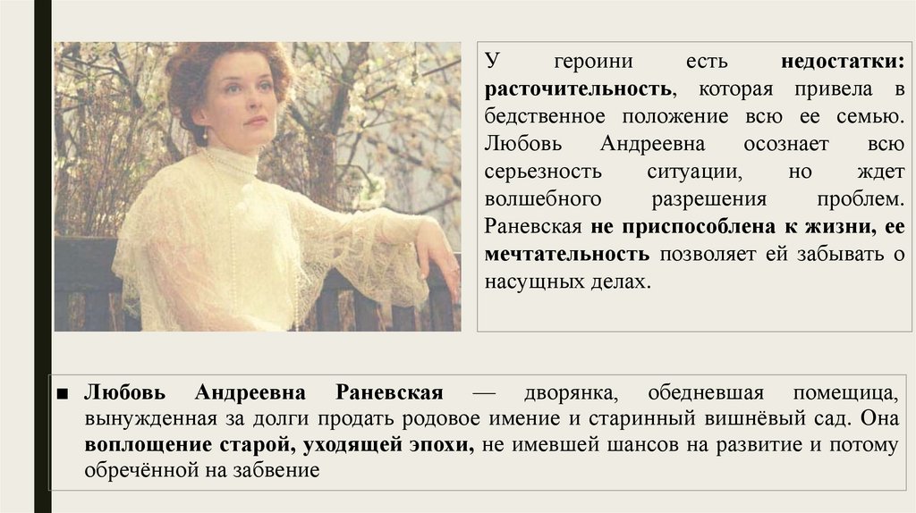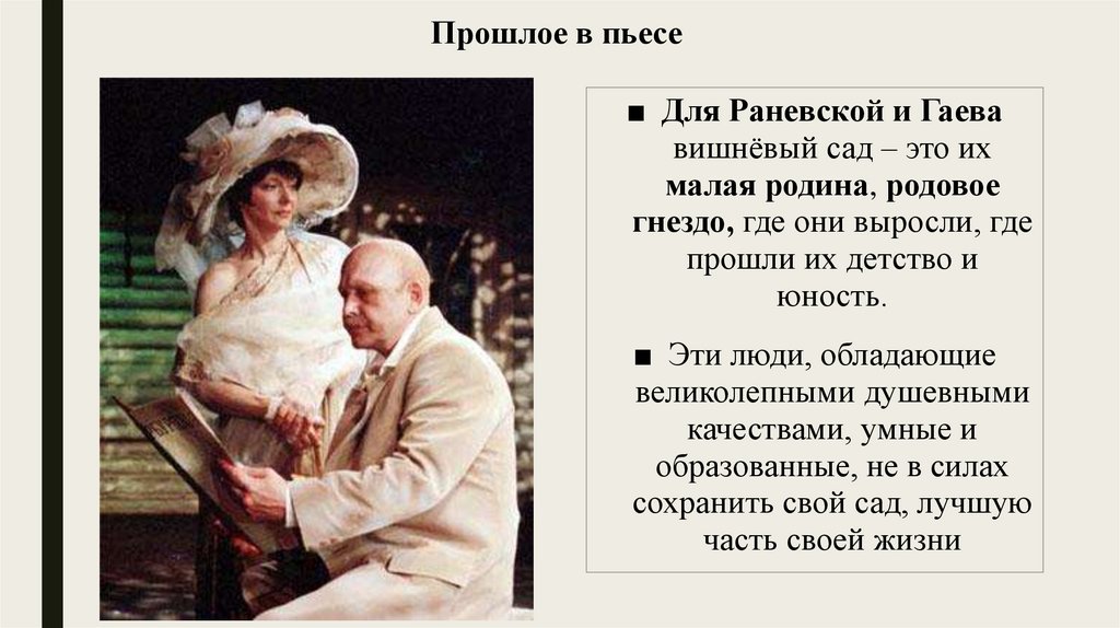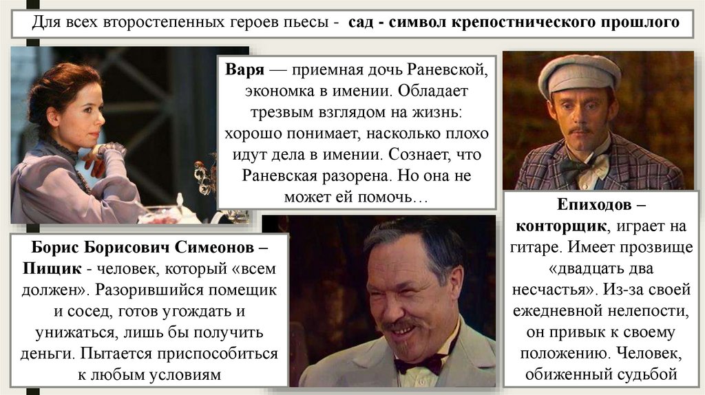 Для всех второстепенных героев пьесы - сад - символ крепостнического прошлогоВаря — приемная дочь Раневской,