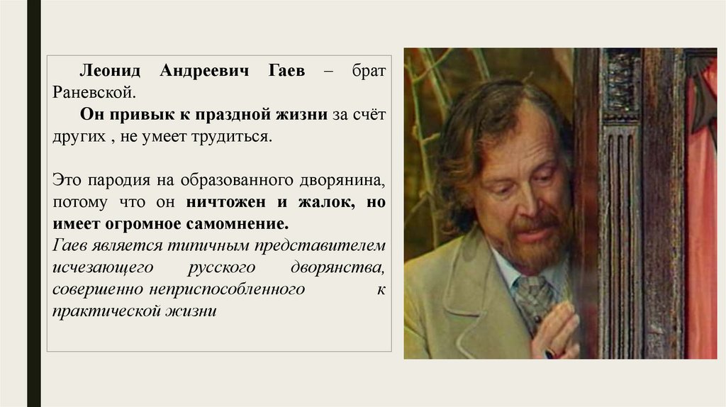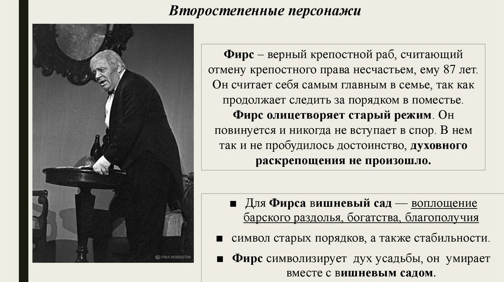 Второстепенные персонажиФирс – верный крепостной раб, считающий