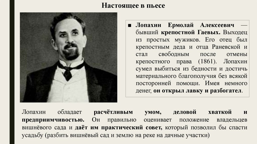 Настоящее в пьесе■ Лопахин Ермолай Алексеевич —