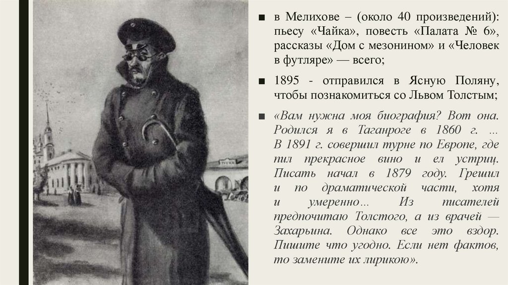 ■ в Мелихове – (около 40 произведений):пьесу «Чайка», повесть «Палата № 6»,