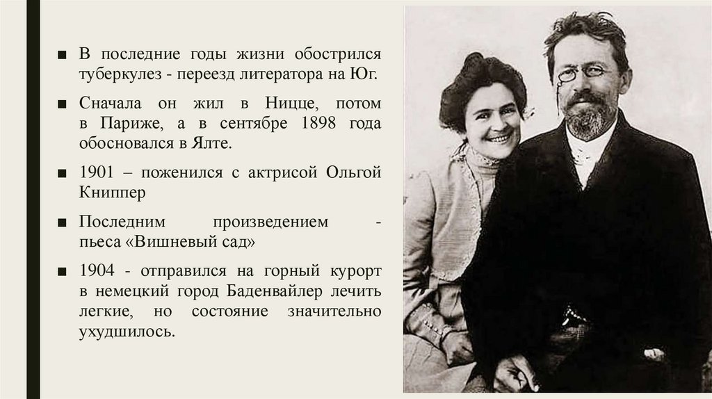 ■ В последние годы жизни обострилсятуберкулез - переезд литератора на Юг.
