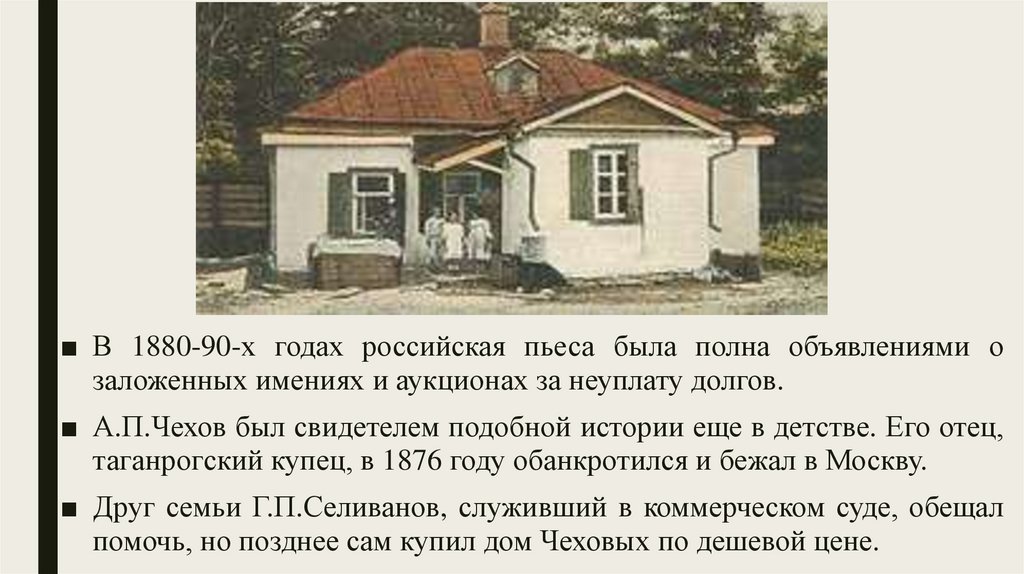 ■ В 1880-90-х годах российская пьеса была полна объявлениями озаложенных имениях и аукционах за неуплату долгов.