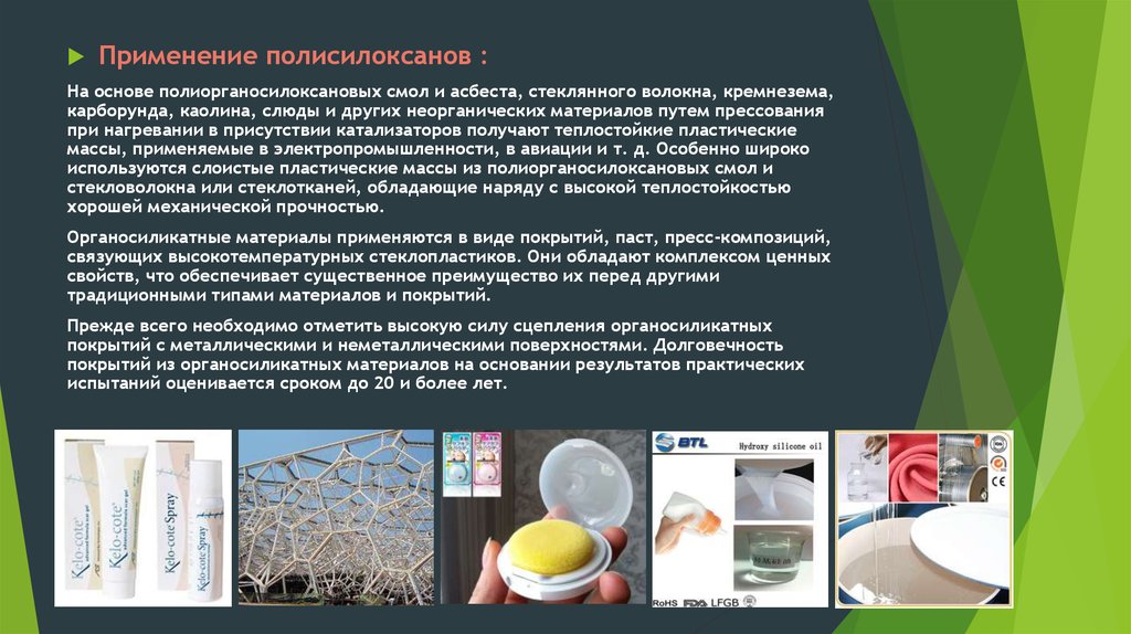 Применение полисилоксанов :На основе полиорганосилоксановых смол и асбеста, стеклянного волокна, кремнезема,