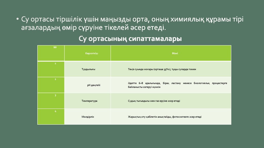 • Су тығыздығы мен тұздар мен газдарды еріту қабілеттілігін