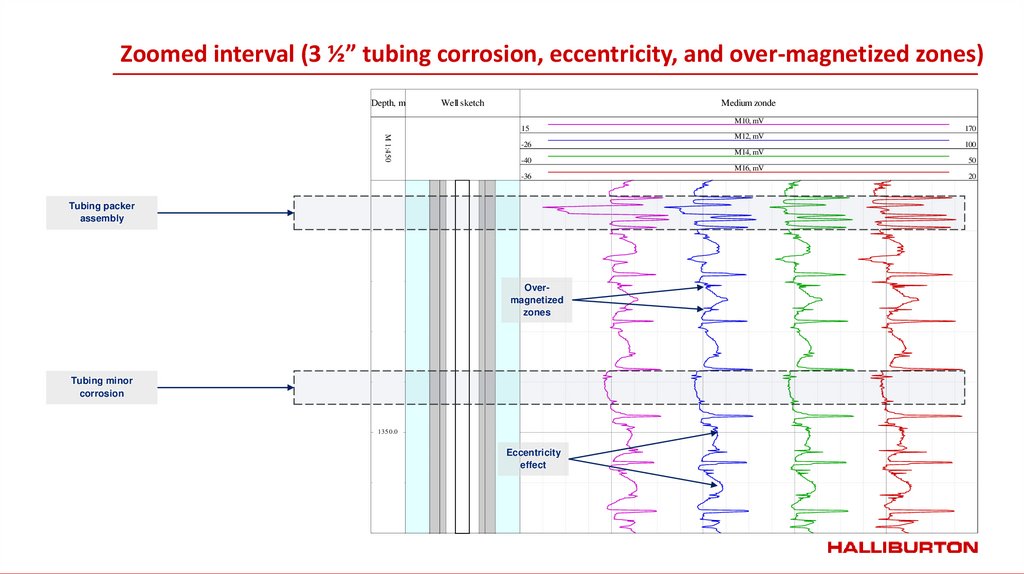 Zoomed interval (3 ½” tubing corrosion, eccentricity, and over-magnetized zones)ПЛАНШЕТ ДАННЫХ ГИС ПО СКВАЖИНЕ