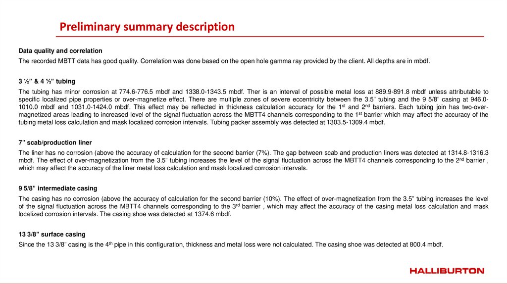 specific localized pipe properties or over-magnetize effect. There are multiple zones of severe eccentricity between the 3.5” tubing and the 9 5/8” casing at 946.01010.0 mbdf and 1031.0-1424.0 mbdf. This effect may be reflected in thickness calculation accuracy for the 1st and 2nd barriers. Each tubing join has two-overmagnetized areas leading to increased level of the signal fluctuation across the MBTT4 channels corresponding to the 1st barrier which may affect the accuracy of the