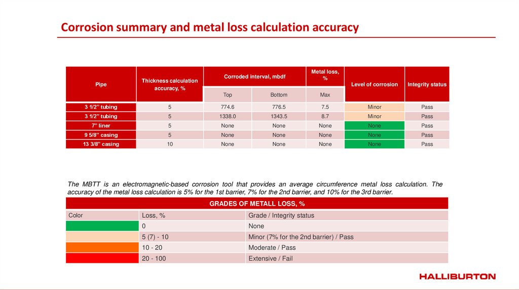 The MBTT is an electromagnetic-based corrosion tool that provides an average circumference metal loss calculation. The
