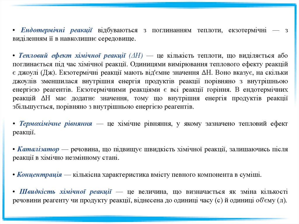 • Ендотермічні реакції відбуваються з поглинанням теплоти, екзотермічні — звиділенням її в навколишнє середовище.