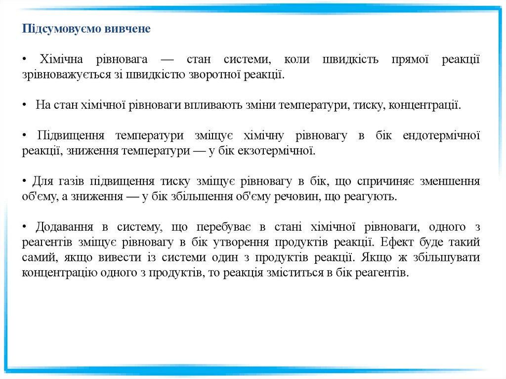 Підсумовуємо вивчене• Хімічна рівновага — стан системи, коли