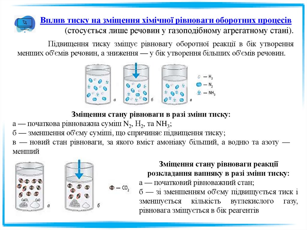 • Для газів підвищення тиску зміщує рівновагу в бік, що спричиняє зменшення