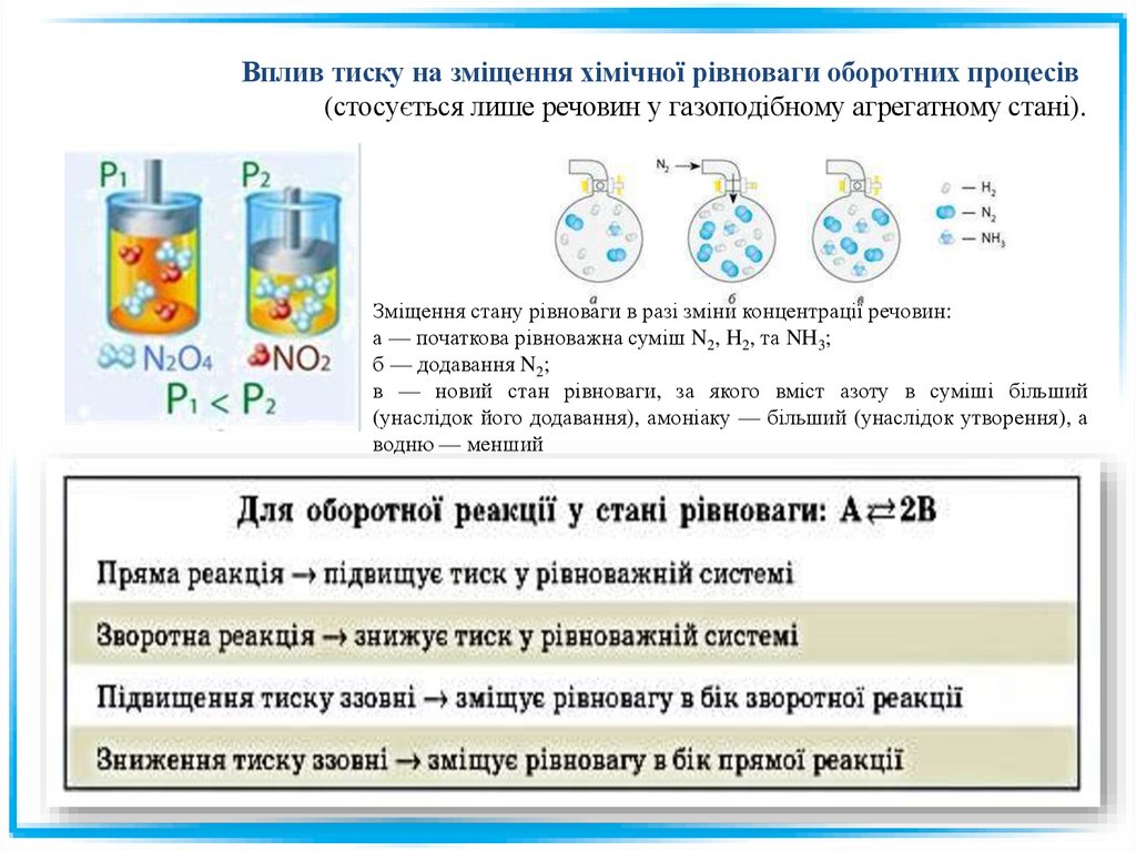 Підвищення тиску зміщує рівновагу оборотної реакції в бік утворення