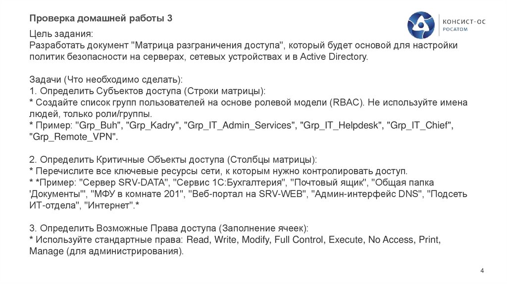 * Создайте список групп пользователей на основе ролевой модели (RBAC). Не используйте имена