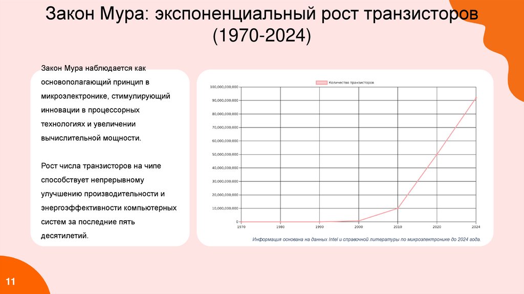 Закон Мура: экспоненциальный рост транзисторов(1970-2024)