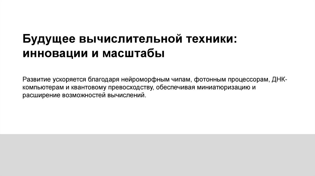 Развитие ускоряется благодаря нейроморфным чипам, фотонным процессорам, ДНКкомпьютерам и квантовому превосходству, обеспечивая миниатюризацию и