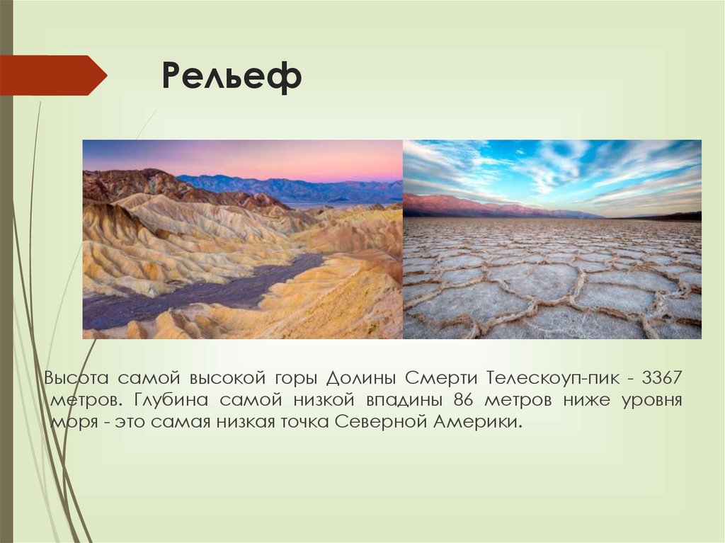 РельефВысота самой высокой горы Долины Смерти Телескоуп-пик - 3367