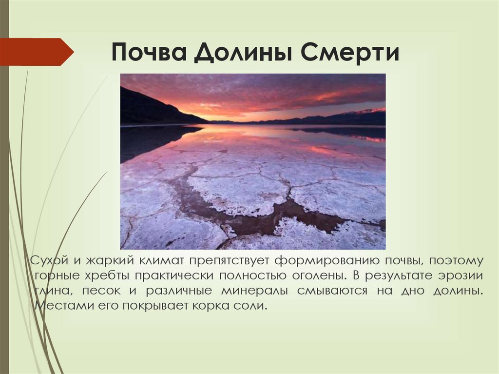 Почва Долины СмертиСухой и жаркий климат препятствует формированию почвы, поэтому