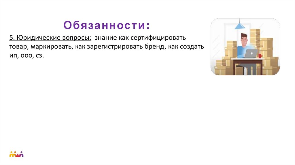 Обязанности:5. Юридические вопросы: знание как сертифицировать