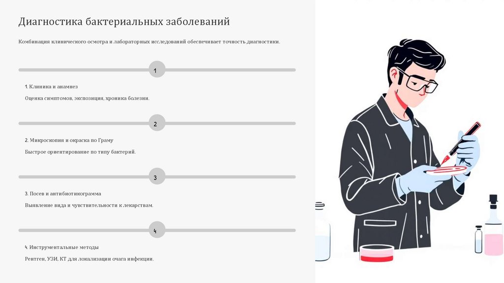 Диагностика бактериальных заболеванийКомбинация клинического осмотра и лабораторных исследований обеспечивает точность диагностики.
