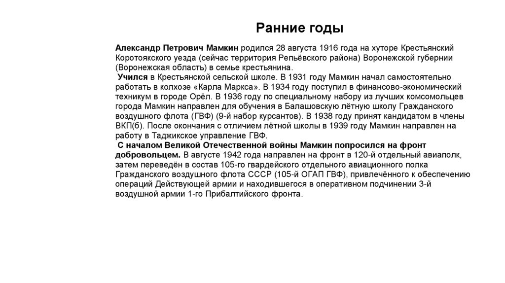 Ранние годыАлександр Петрович Мамкин родился 28 августа 1916 года на хуторе Крестьянский