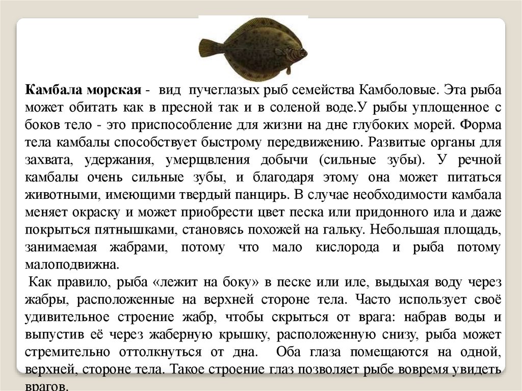 Камбала морская - вид пучеглазых рыб семейства Камболовые. Эта рыбаможет обитать как в пресной так и в соленой воде.У рыбы уплощенное с