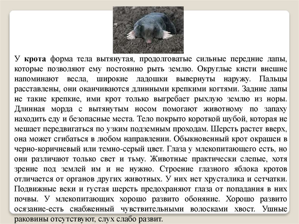 У крота форма тела вытянутая, продолговатые сильные передние лапы,которые позволяют ему постоянно рыть землю. Округлые кисти внешне