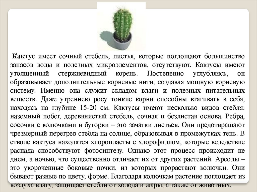 Кактус имеет сочный стебель, листья, которые поглощают большинствозапасов воды и полезных микроэлементов, отсутствуют. Кактусы имеют