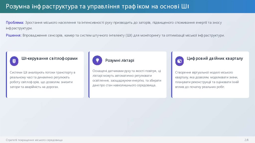 Розумна інф раструкт ура та управління траф іком на ос нов і ШІПроблема: Зростання міського населення та інтенсивності руху призводить до заторів, підвищеного споживання енергії та зносу