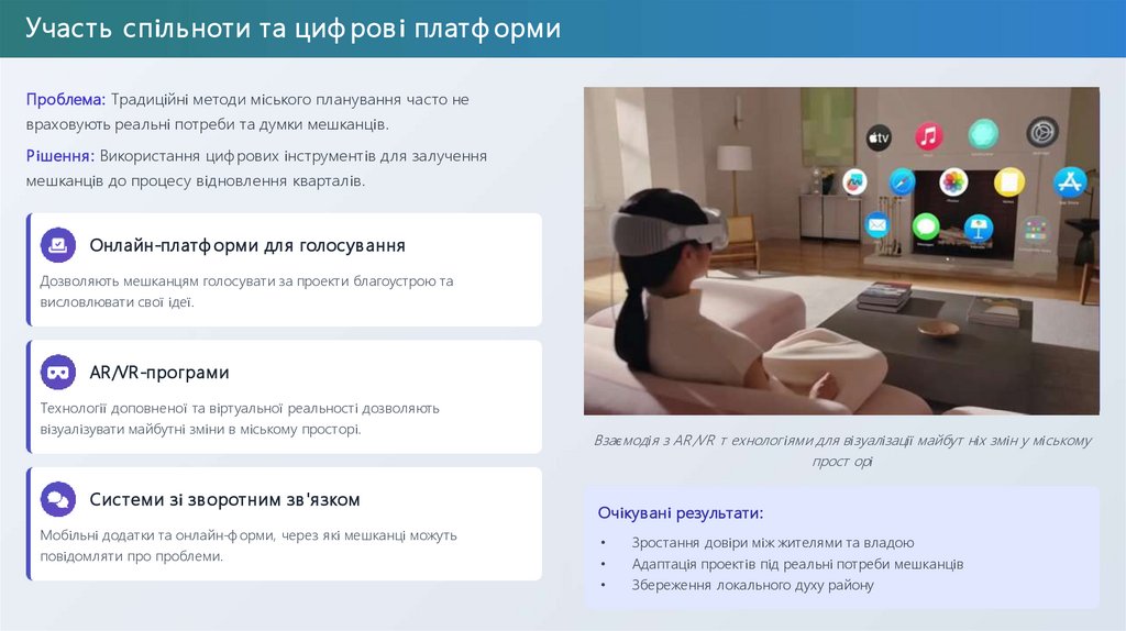 Участь спільноти та циф ров і платф ормиПроблема: Традиційні методи міського планування часто не