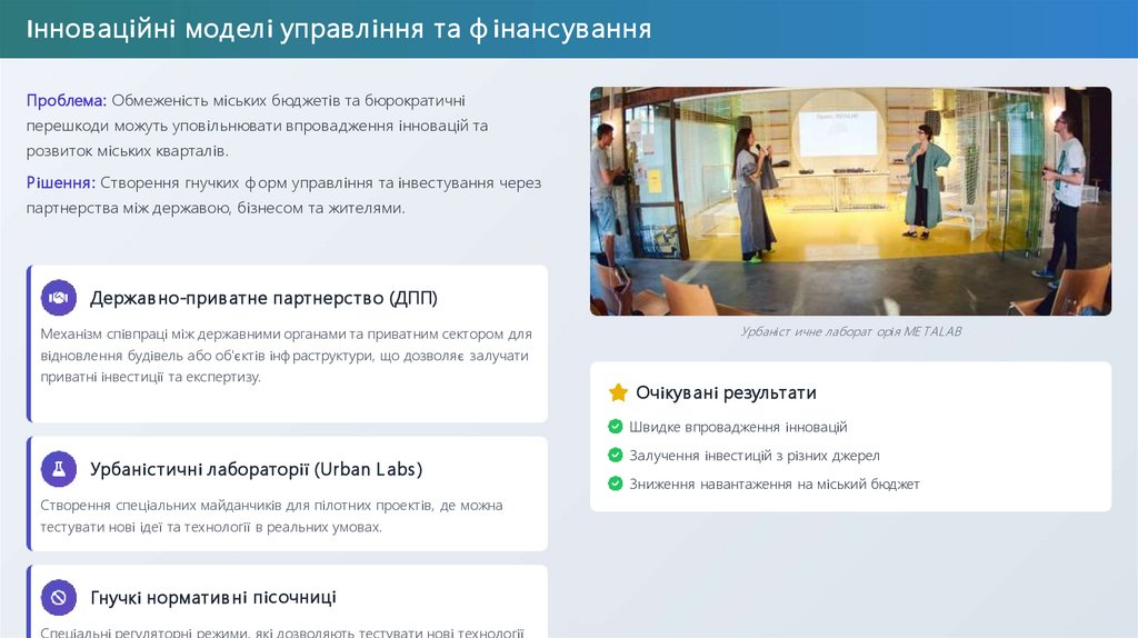 Інноваційні моделі управління та ф інансуванняПроблема: Обмеженість міських бюджетів та бюрократичні