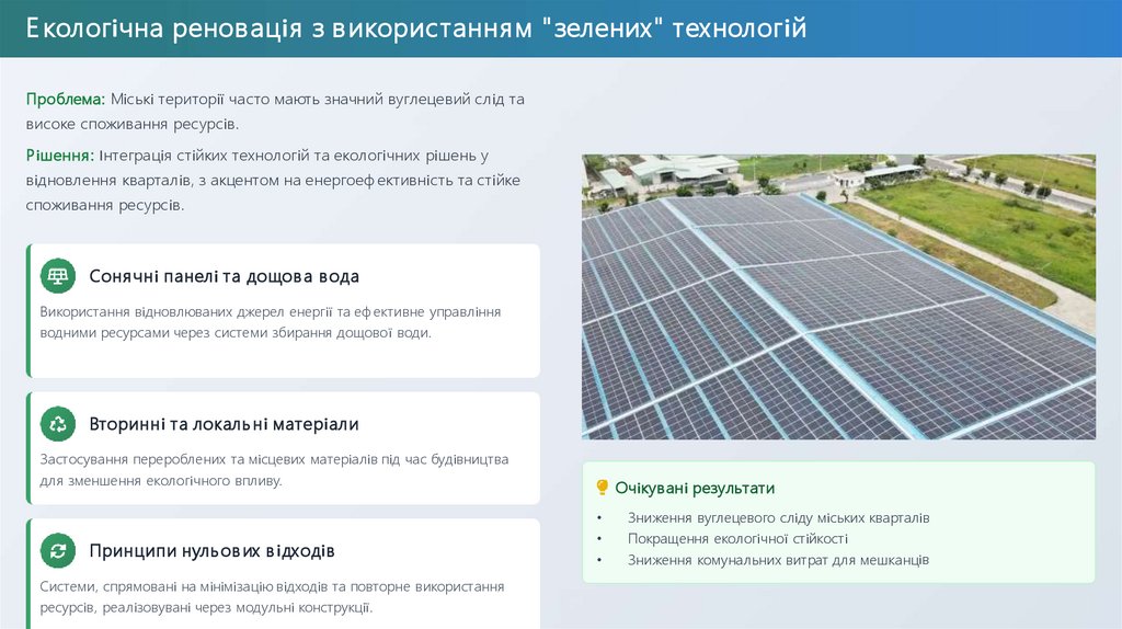 Е кологічна реновація з в икористанням " зелених" технологійПроблема: Міські території часто мають значний вуглецевий слід та