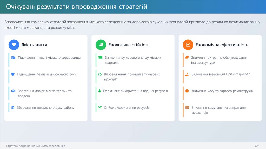 Очікувані результати в провадження стратегійВпровадження комплексу стратегій покращення міського середовища за допомогою сучасних технологій призведе до реальних позитивних змін у