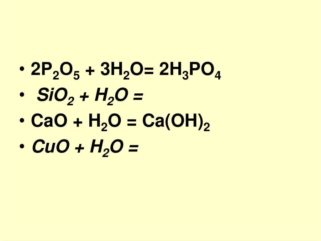 • 2Р2О5 + 3H2O= 2H3PO4• SiO2 + H2O =
