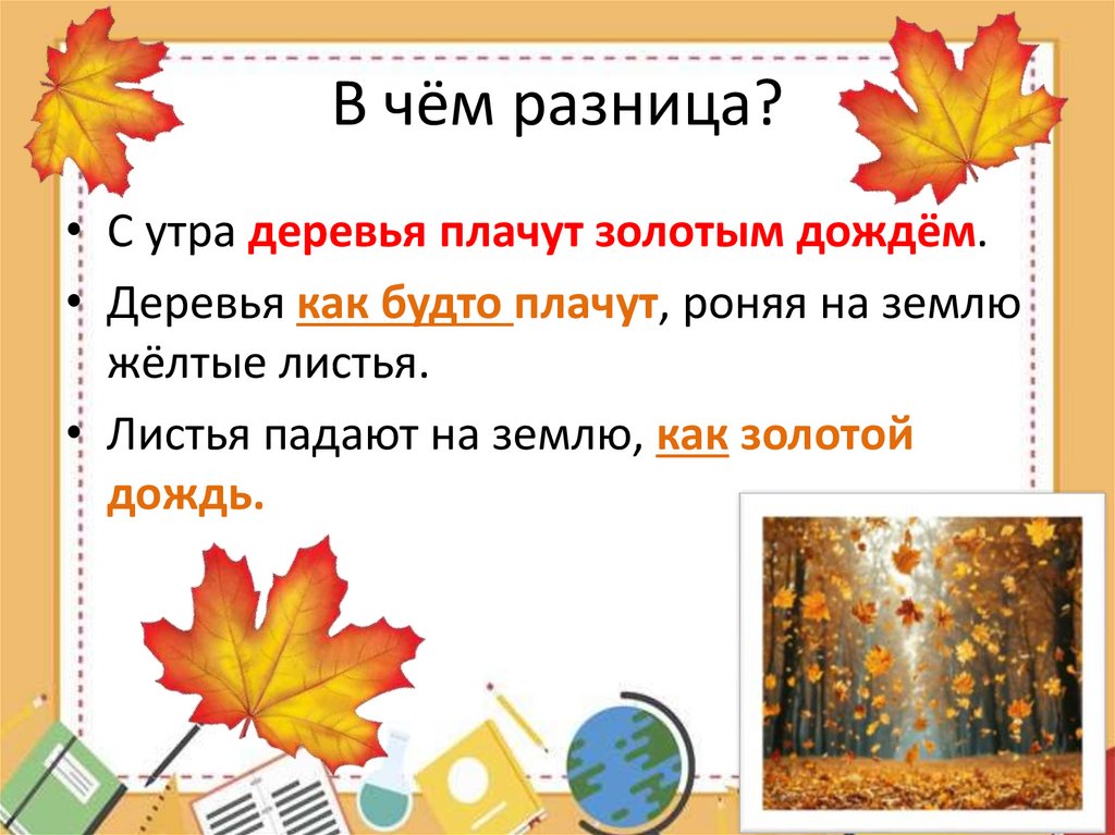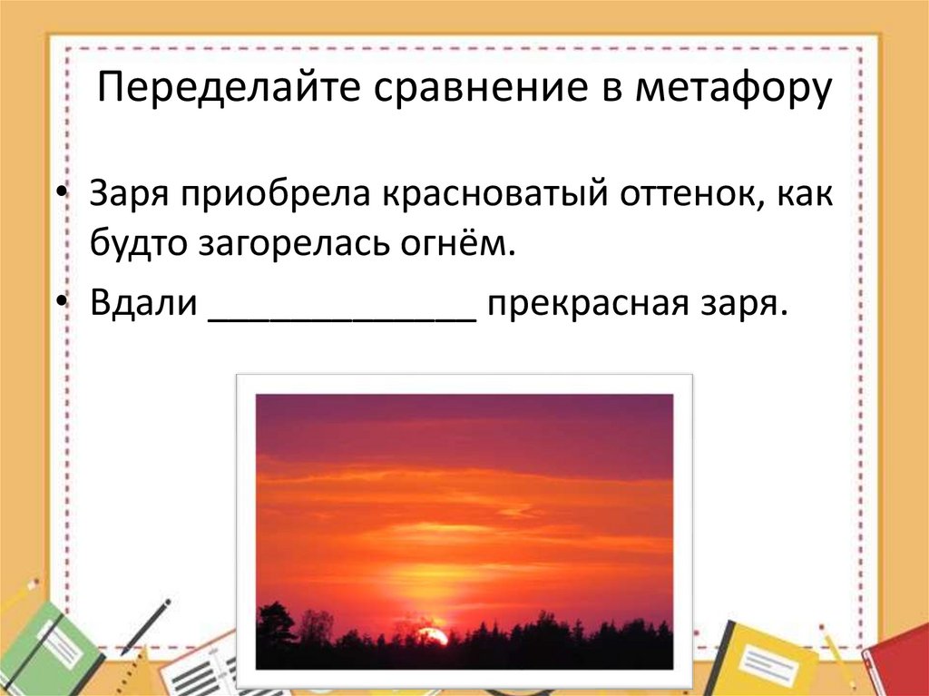 Переделайте сравнение в метафору• Заря приобрела красноватый оттенок, как