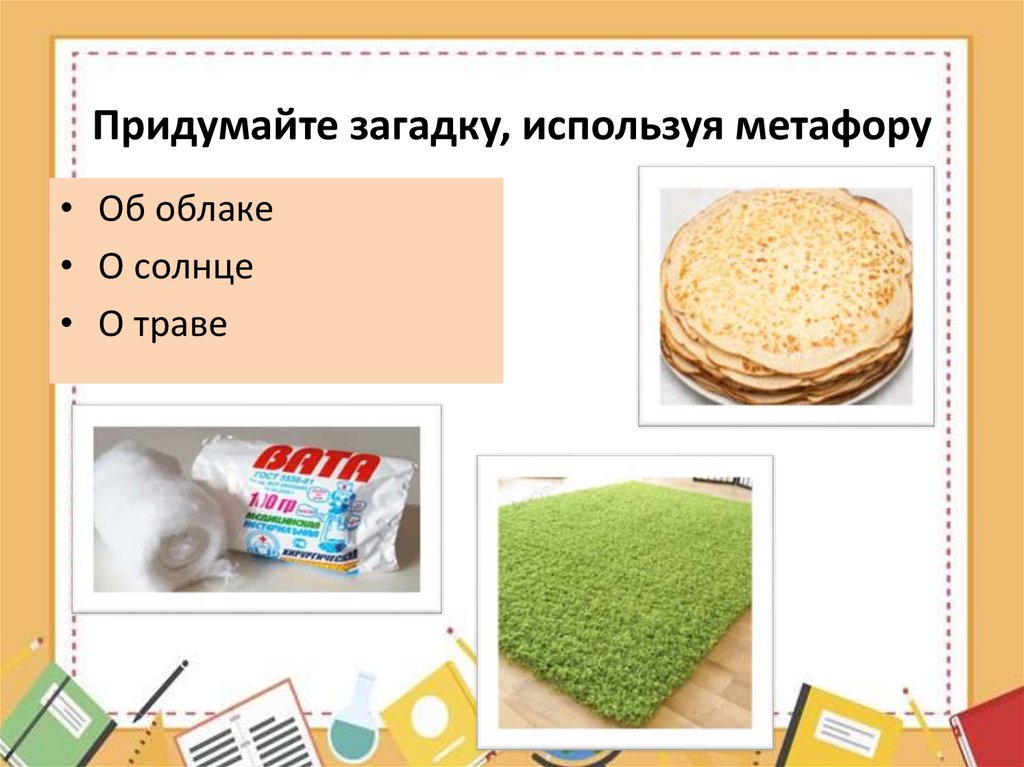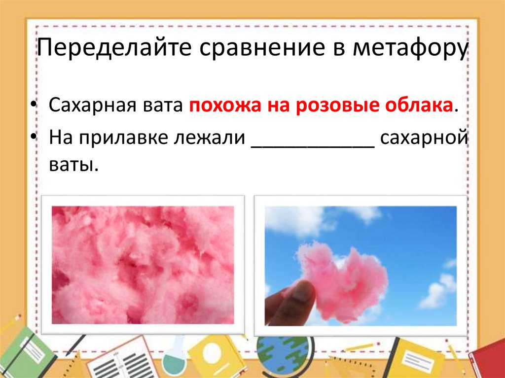 Переделайте сравнение в метафору• Сахарная вата похожа на розовые облака.
