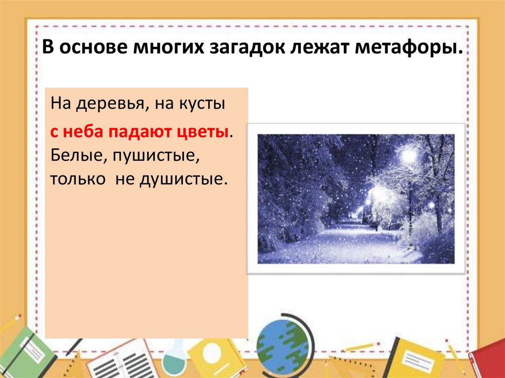 В основе многих загадок лежат метафоры.На деревья, на кусты