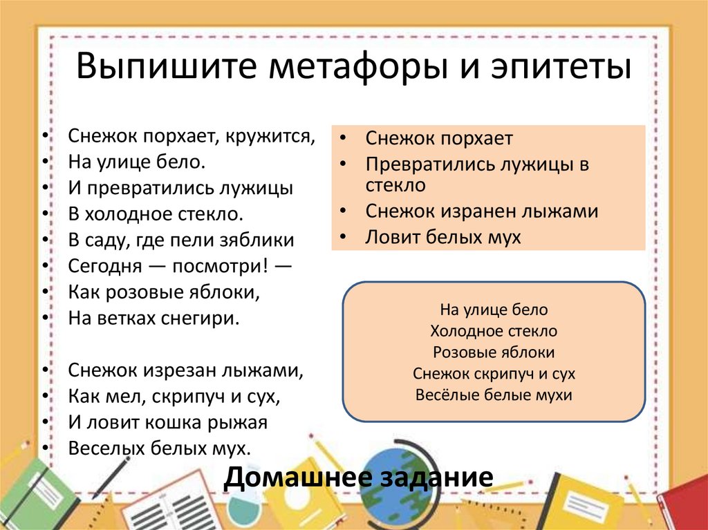 Выпишите метафоры и эпитетыСнежок порхает, кружится,