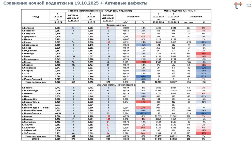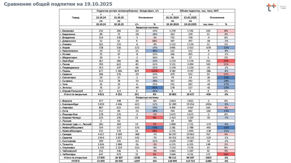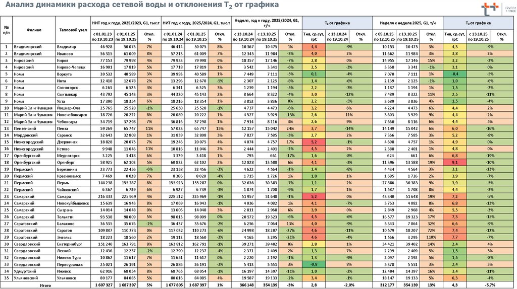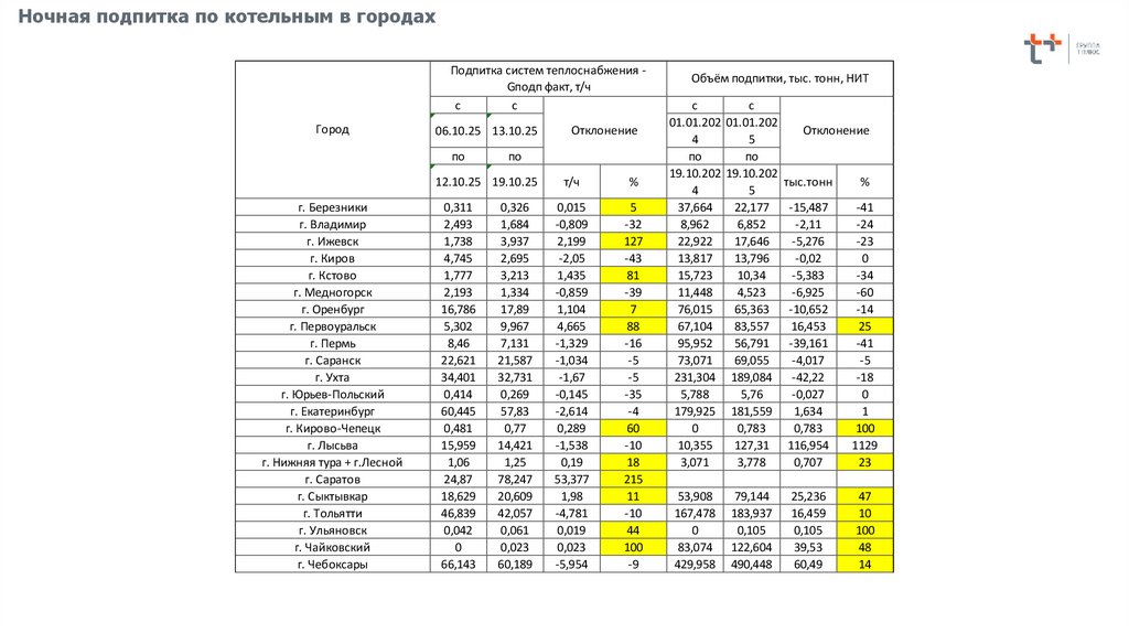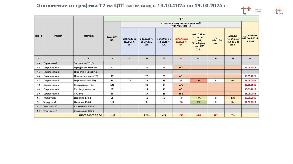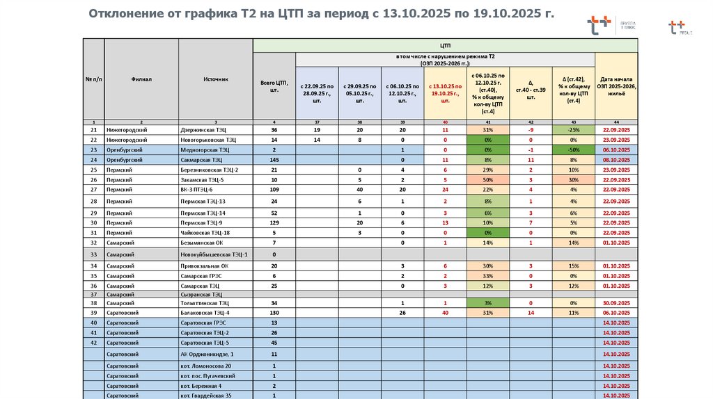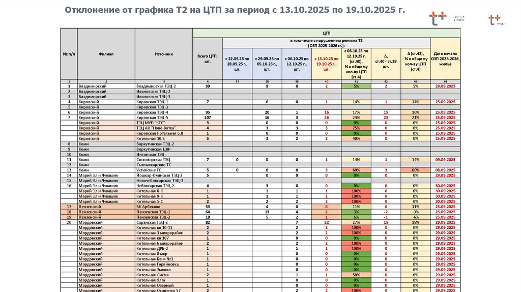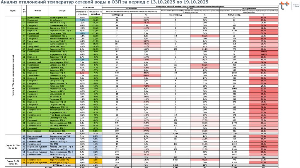 Отклонение от графика Т2 на котельных свыше 1 Гкал/ч за период с 13.10.2025 по19.10.2025 г.