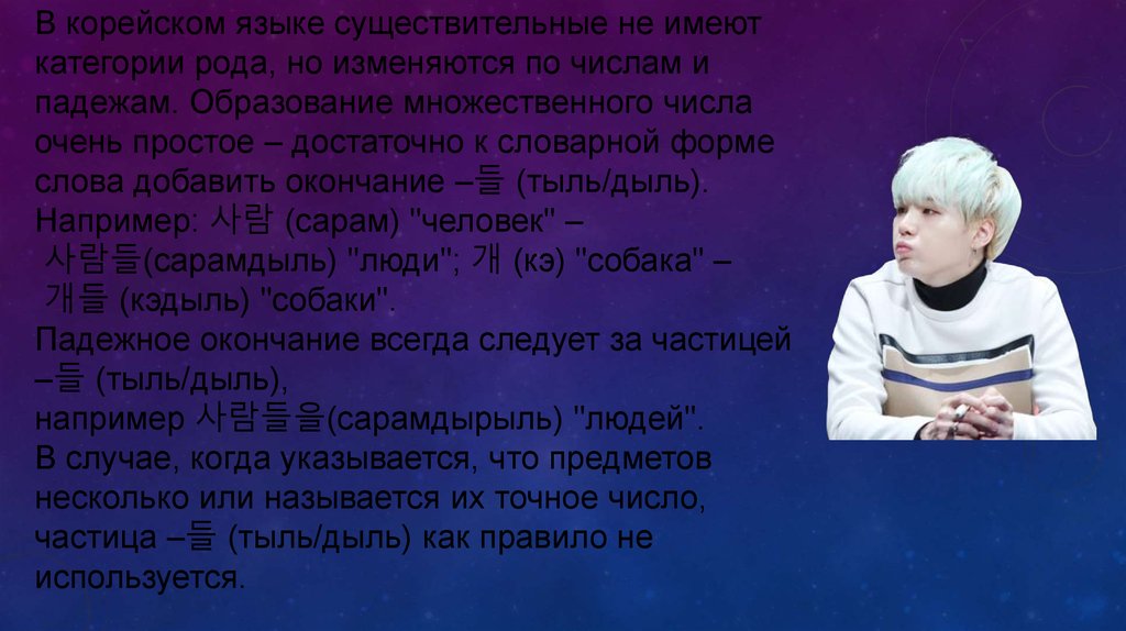 В корейском языке существительные не имеюткатегории рода, но изменяются по числам и