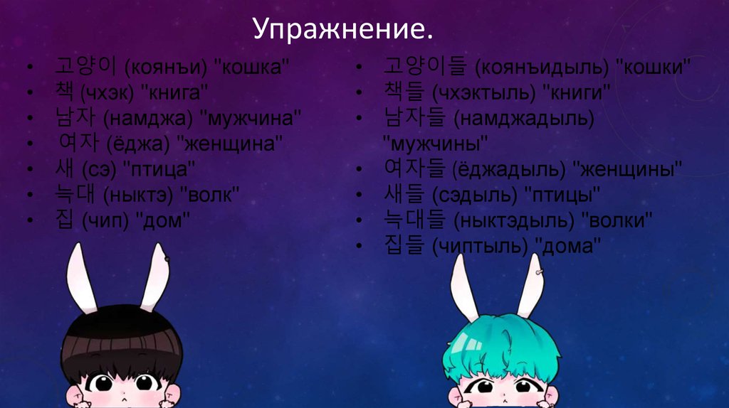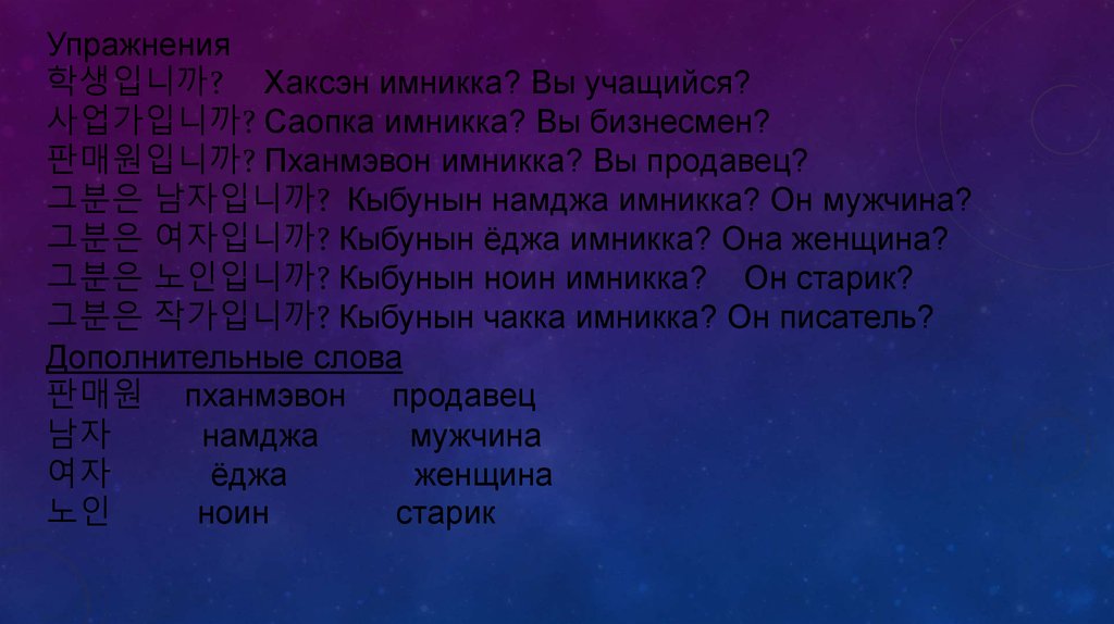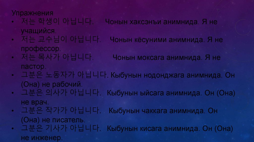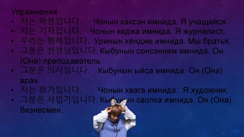 Упражнения• 저는 학생입니다. Чонын хаксэн имнида. Я учащийся.