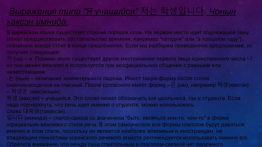 Выражения типа "Я учащийся" 저는 학생입니다. Чонынхаксэн имнида.