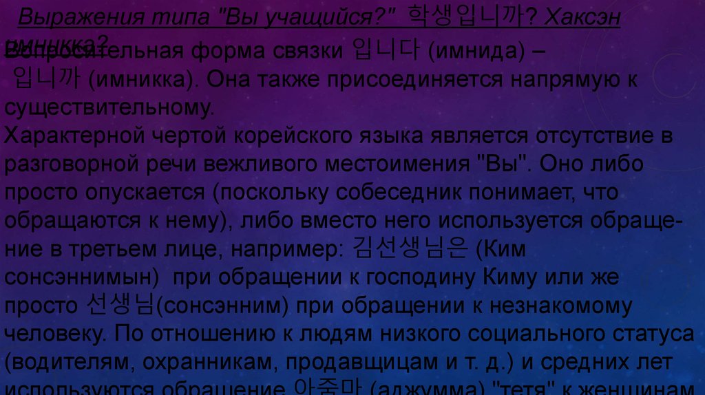 Выражения типа "Вы учащийся?" 학생입니까? Хаксэнимникка?