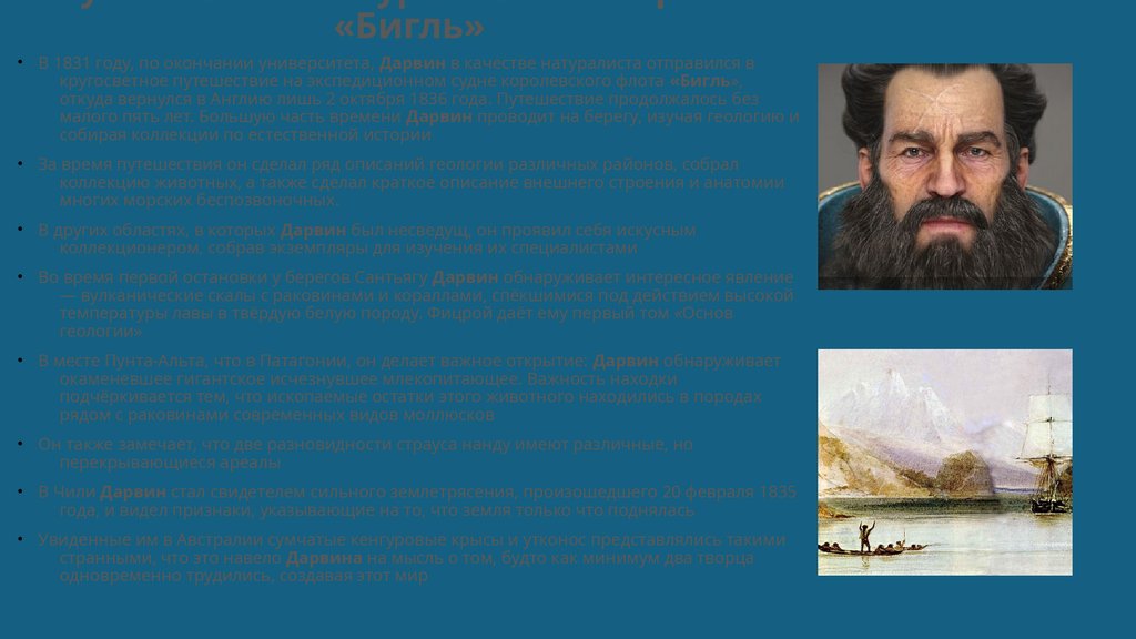 малого пять лет. Большую часть времени Дарвин проводит на берегу, изучая геологию и