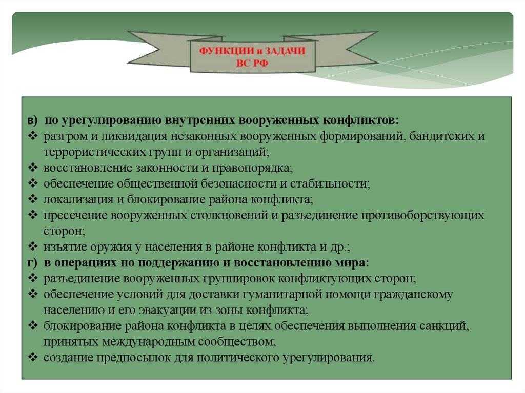в) по урегулированию внутренних вооруженных конфликтов:разгром и ликвидация незаконных вооруженных формирований, бандитских и