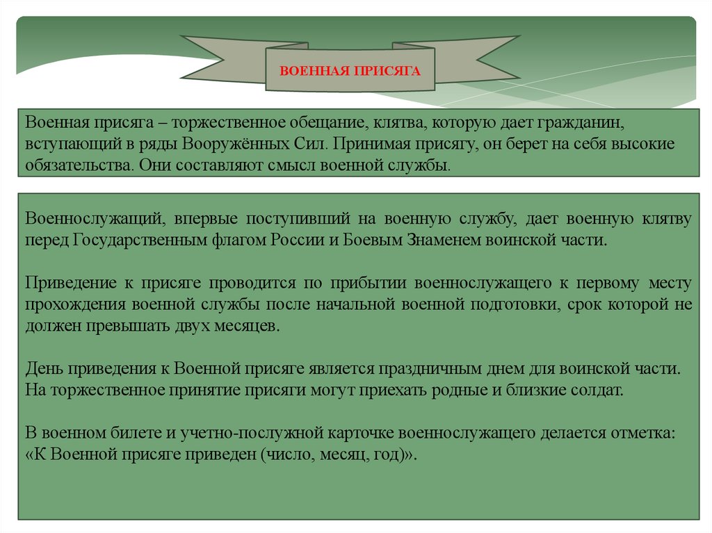 ВОЕННАЯ ПРИСЯГАВоенная присяга – торжественное обещание, клятва, которую дает гражданин,