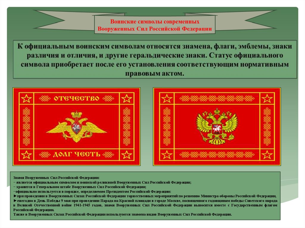 Знамя Вооруженных Сил Российской Федерации:− является официальным символом и воинской реликвией Вооруженных Сил Российской Федерации;