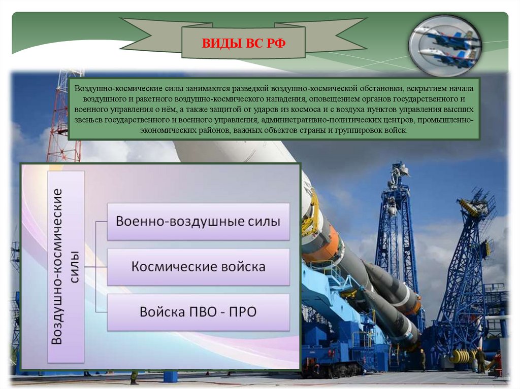 ВИДЫ ВС РФВоздушно-космические силы занимаются разведкой воздушно-космической обстановки, вскрытием начала