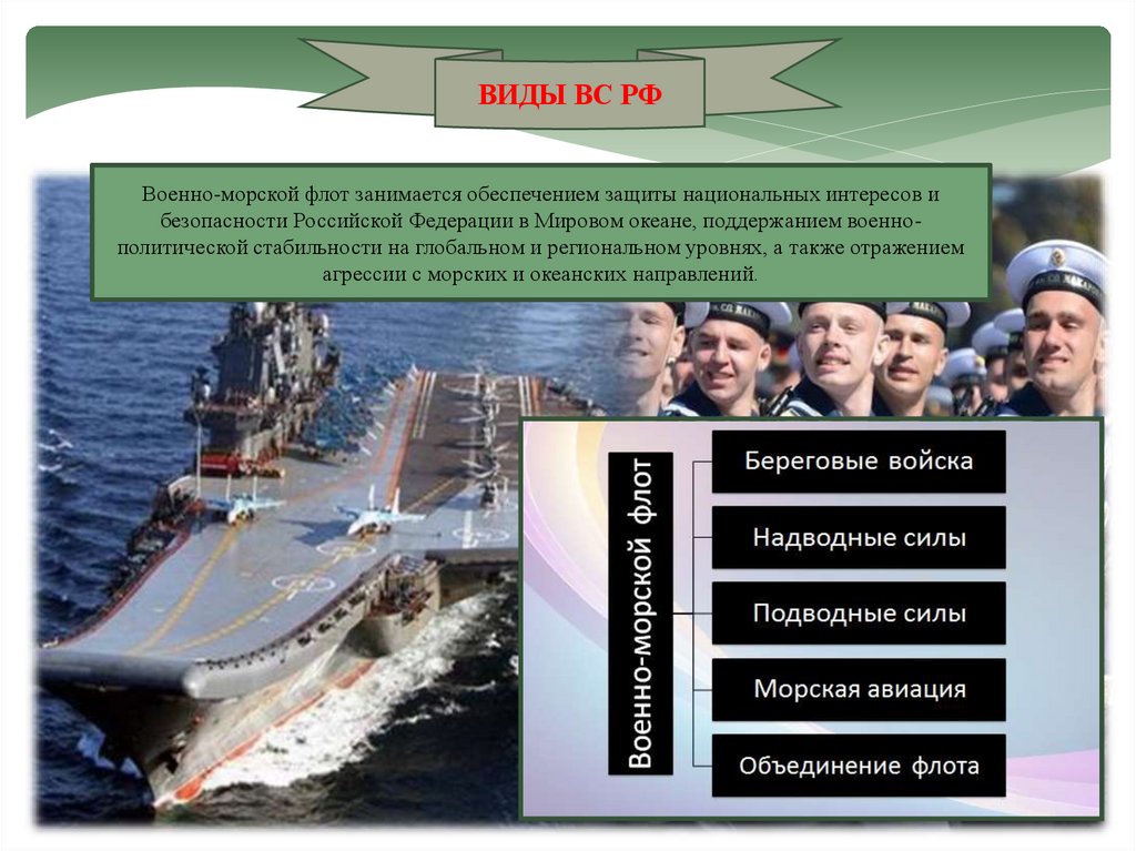 ВИДЫ ВС РФВоенно-морской флот занимается обеспечением защиты национальных интересов и