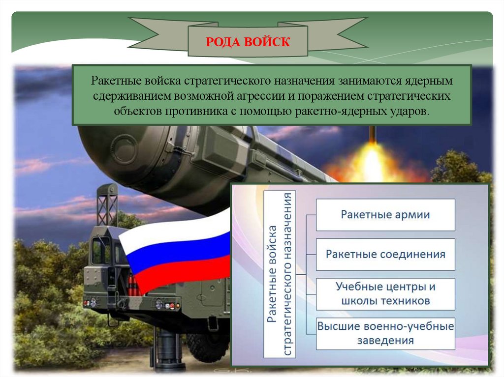 РОДА ВОЙСКРакетные войска стратегического назначения занимаются ядерным