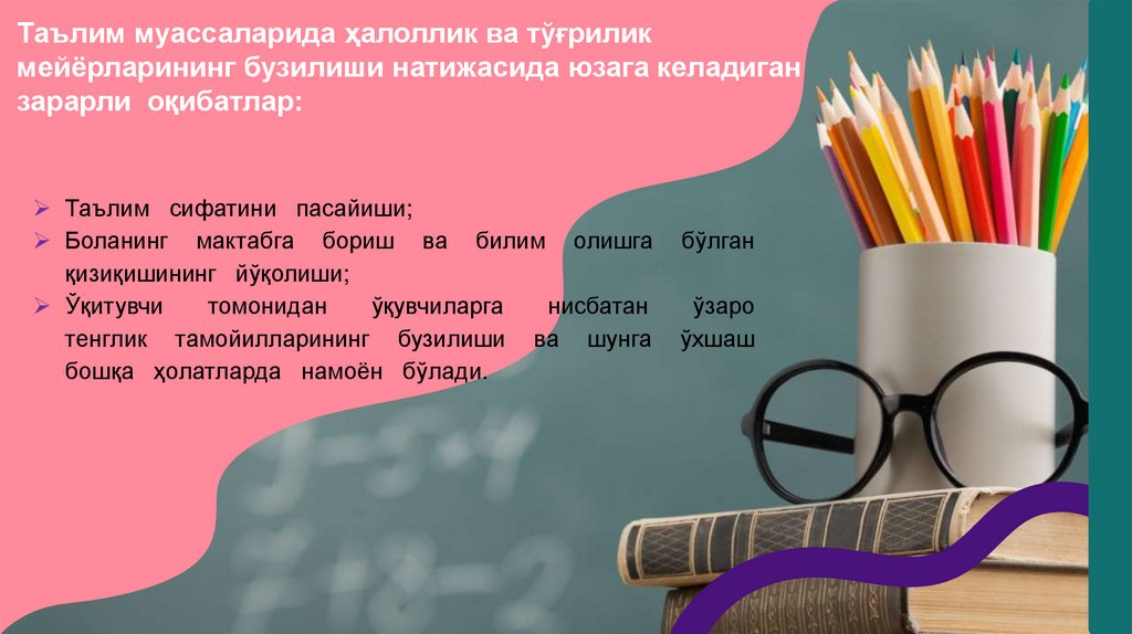 Таълим муассаларида ҳалоллик ва тўғриликмейёрларининг бузилиши натижасида юзага келадиган