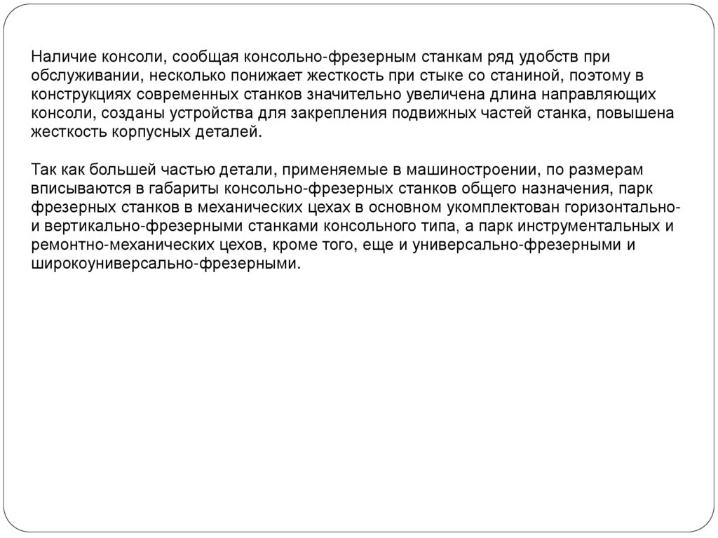 Наличие консоли, сообщая консольно-фрезерным станкам ряд удобств приобслуживании, несколько понижает жесткость при стыке со станиной, поэтому в
